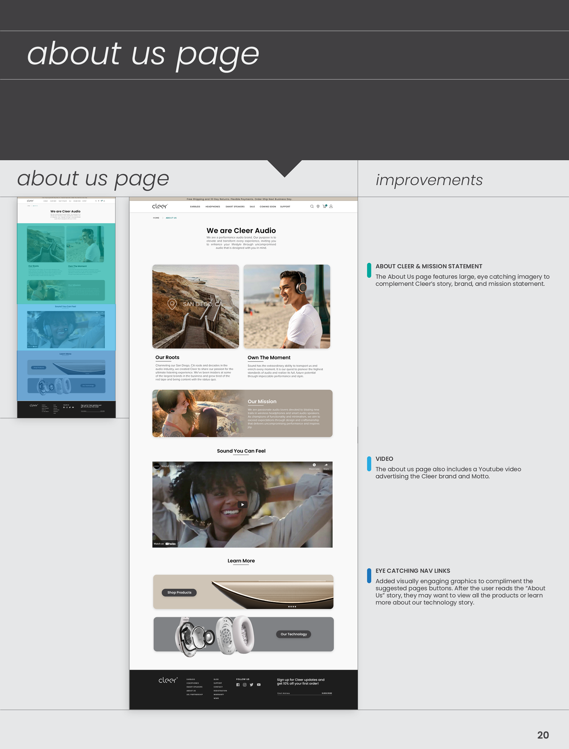 The e-commerce site for San Diego based Cleer audio. A company that designs, manufactures, and sells high-end noise cancelling headphones, earbuds, and speakers. In 2021 we redesigned and added functionalality to the existing website. The site runs on WordPress, and designs were created using Illustrator and Adobe XD. We work with developers to maintain the site.